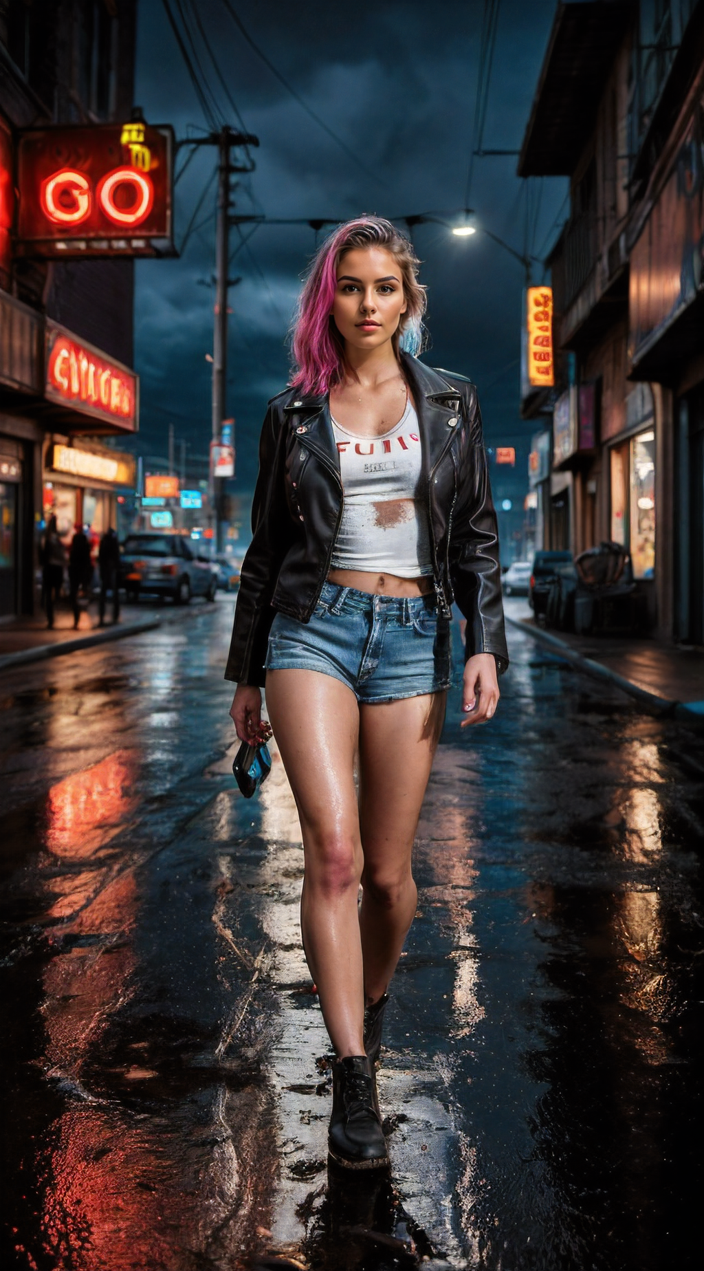Cyber-enhanced woman, cyberpunk cityscape, neon lights, intense, cinematic.