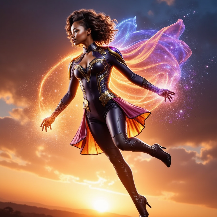Stylish female hero channeling cosmic power, dynamic pose mid-leap, galaxy swirling in her cape, metallic armor with gold-infused circuitry, blazing horizon, Marvel comic-to-film realism