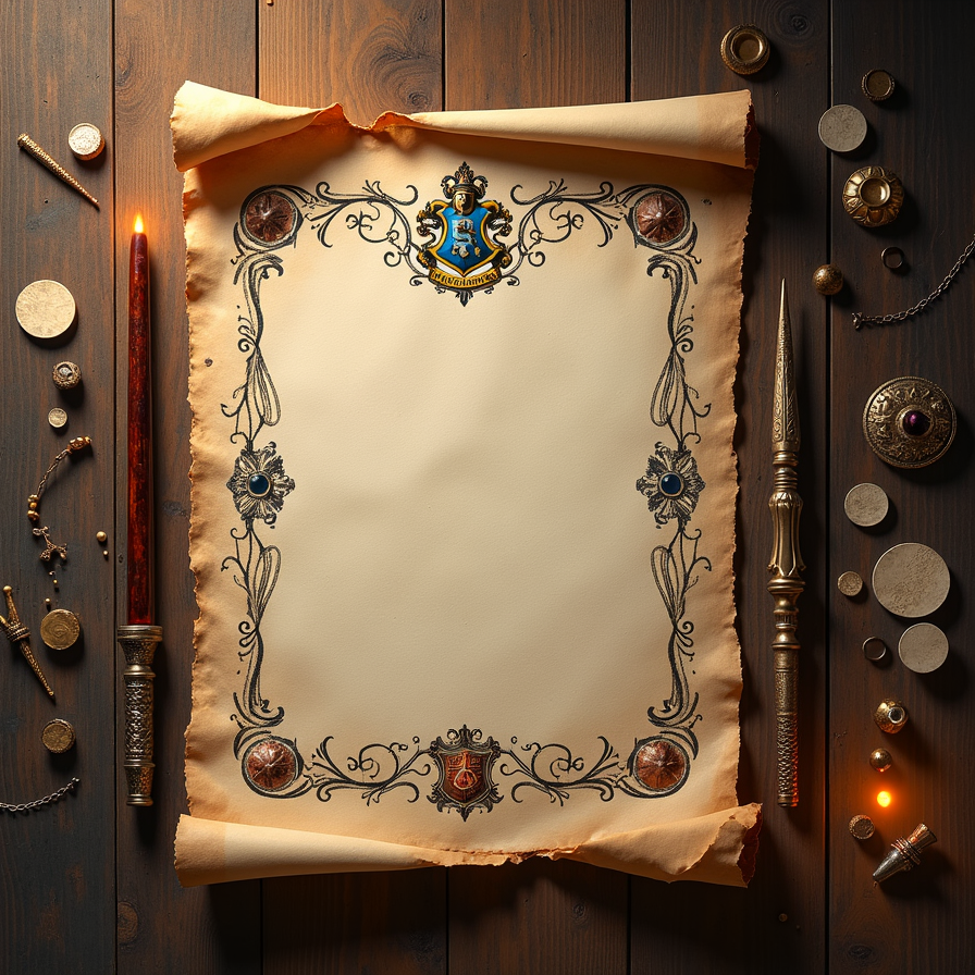 A parchment-style invitation with aged, textured paper. Include intricate borders featuring magical symbols like wands, cauldrons, and Hogwarts house crests. The text should appear handwritten, surrounded by subtle glowing spell effects for an authentic wizarding feel.