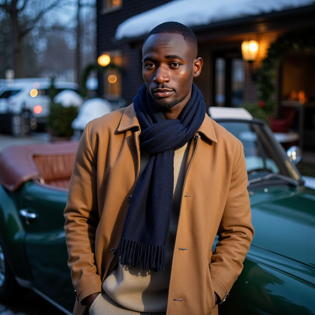Man leaning against a deep-green vintage convertible parked near a pine-lined driveway, subtle snowfall. Hairstyle: slicked back with matte finish, short beard trimmed. Attire: camel wool coat, navy cashmere scarf. Fabric details: crisp wool texture, fine cashmere fibers. Camera: slightly low angle, 35mm, f/2.0 for cinematic perspective. Lighting: cool blue dusk ambient + warm reflection from nearby holiday lights.…
