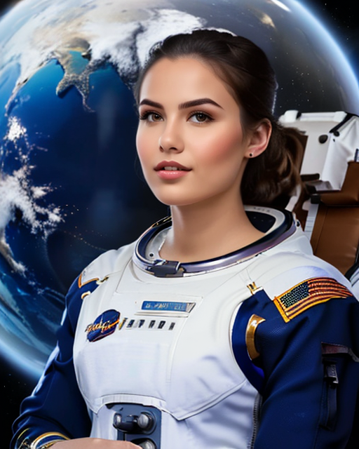 Female astronaut in spacecraft, reflective visor, starry surroundings.