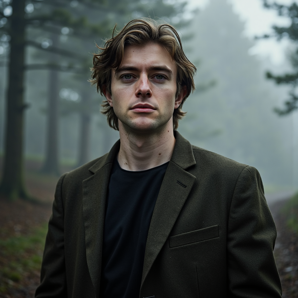 A cinematic atmospheric portrait of a man (late 20s) standing still in a fog-filled forest at dawn, waist-up framing, camera at eye level, subject slightly off-center to the right. Hair: medium-length straight hair, naturally parted, slightly damp from mist. Face: realistic skin texture with visible pores, faint redness around nose from cold air, neutral lips, focused eyes looking directly into the lens. Wardrobe:…