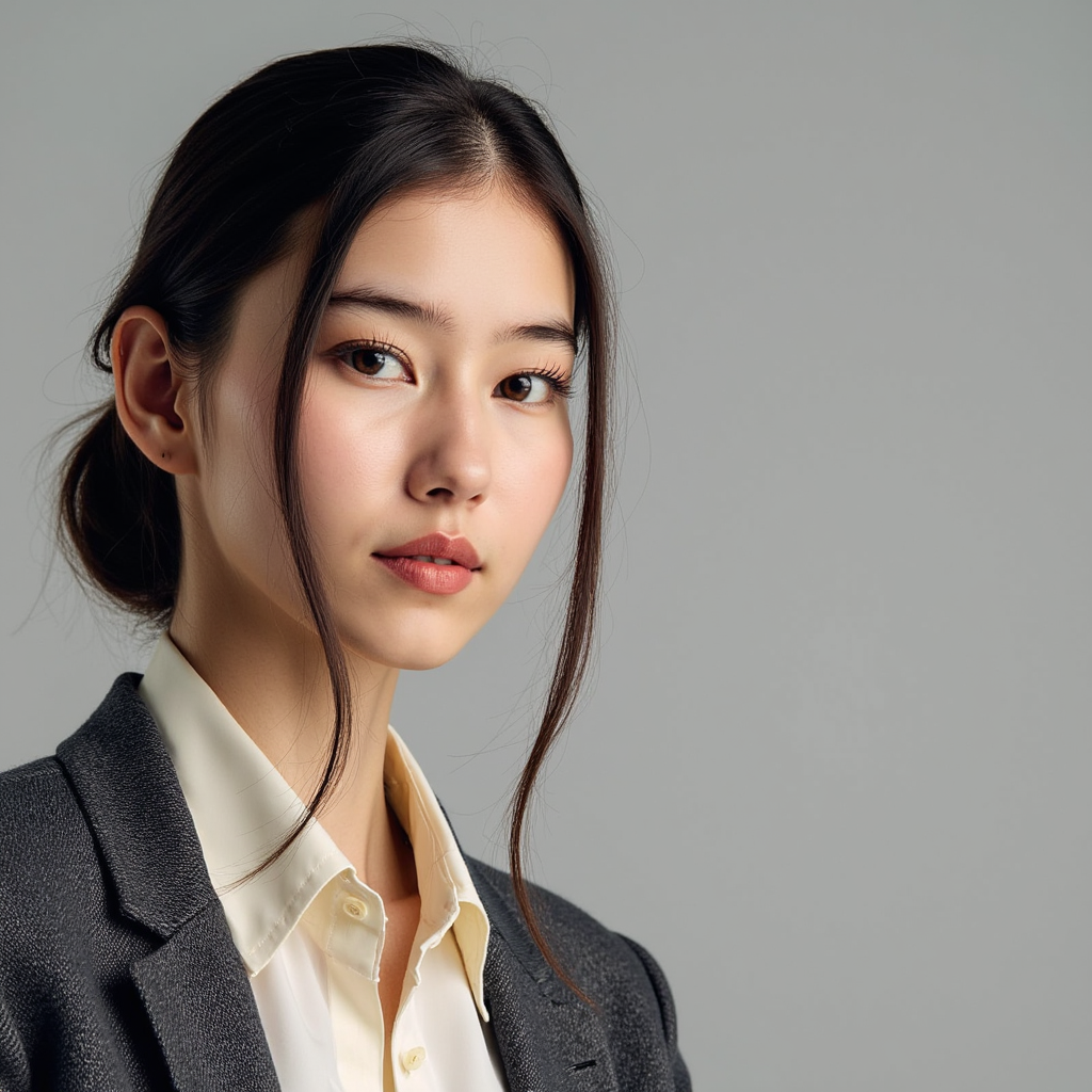 Highly detailed, highly realistic, HDR portrait of a woman executive with a sleek low bun and center part; charcoal wool blazer layered over a soft ivory silk blouse; fabric texture visible in folds. Camera: 85mm lens, f/2.0, ISO 200, eye-level, chest-up framing. Lighting: large octabox key at 45° camera left, subtle reflector fill from camera right, faint rim light separating hair from backdrop; natural shadow falls…