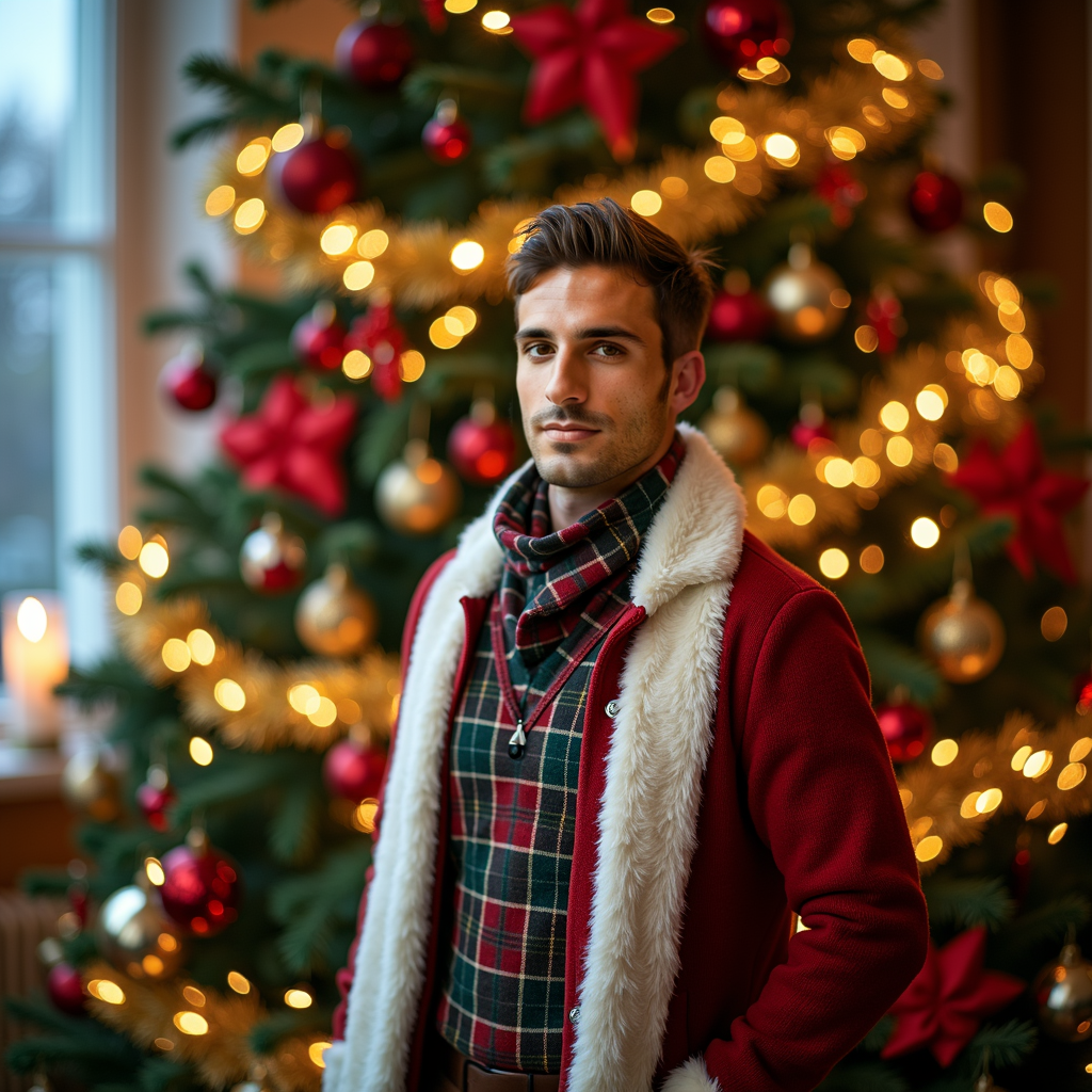 Man in festive vibe of Christmas AI, decorated christmas tree backdrop using AI Christmas Photo Generator.