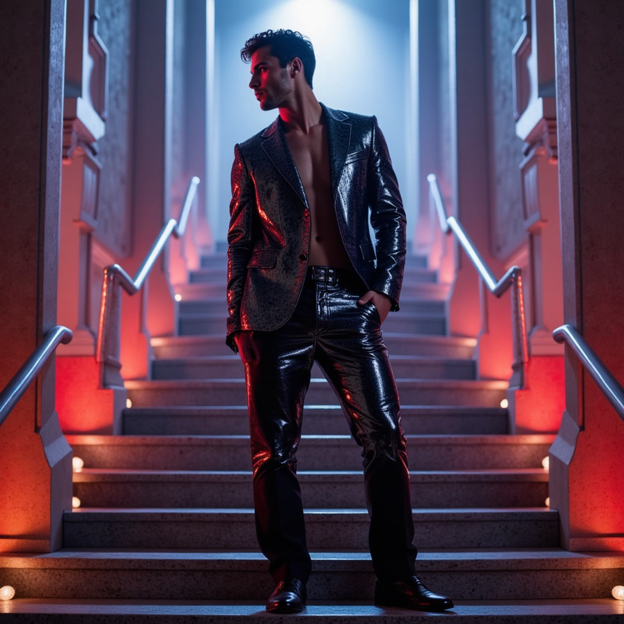 A futuristic Met Gala concept featuring a glowing LED bodysuit with transparent textures, levitating accessories, captured in cinematic spotlight on a surreal red carpet setting