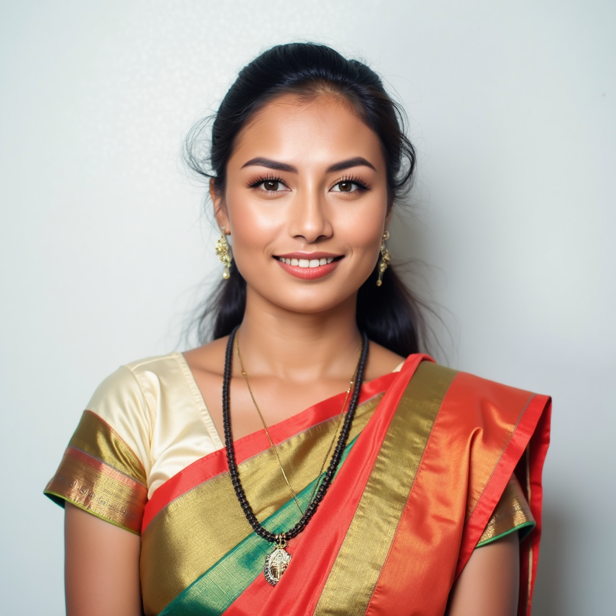 A passport-size photo of a person wearing traditional Indian attire, such as a saree or kurta, with neat and formal styling. The background is plain white, with even lighting. The individual is centered, maintaining a neutral expression, looking directly at the camera
