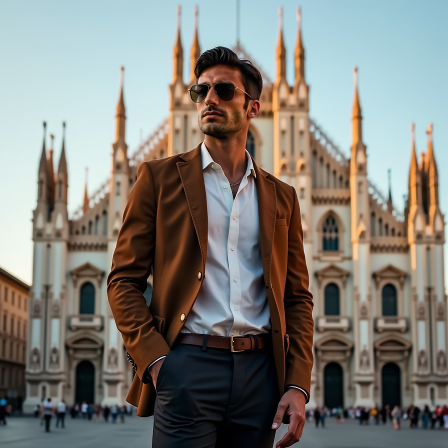 man standing in elegant attire, Duomo di Milano in the background, warm afternoon lighting, stylishly posed with confidence