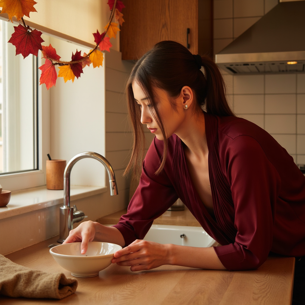 Highly detailed, highly realistic, hyperrealistic HDR image of a woman (female, ~30 yrs) captured waist-up in a softly lit kitchen. She is leaning slightly forward, gently setting a ceramic dish on the counter. She wears a deep burgundy blouse with soft pleats, subtle sheen of satin visible under warm ambient light. Her hair is tied neatly in a mid-height ponytail; a few wisps frame her cheeks. Lighting warm and…