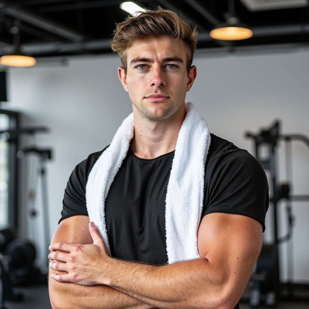 Man, athletic build, head-and-shoulders studio portrait with a towel draped around neck ends resting loosely on chest (hands relaxed down out of frame); neat short haircut, clean stubble, confident neutral expression; moisture-wicking black tee with fine micro-mesh paneling; high-key white seamless background; camera at eye level, 105mm, f/5.6, 1/160, ISO 100; clamshell lighting (large softbox above, reflector below)…