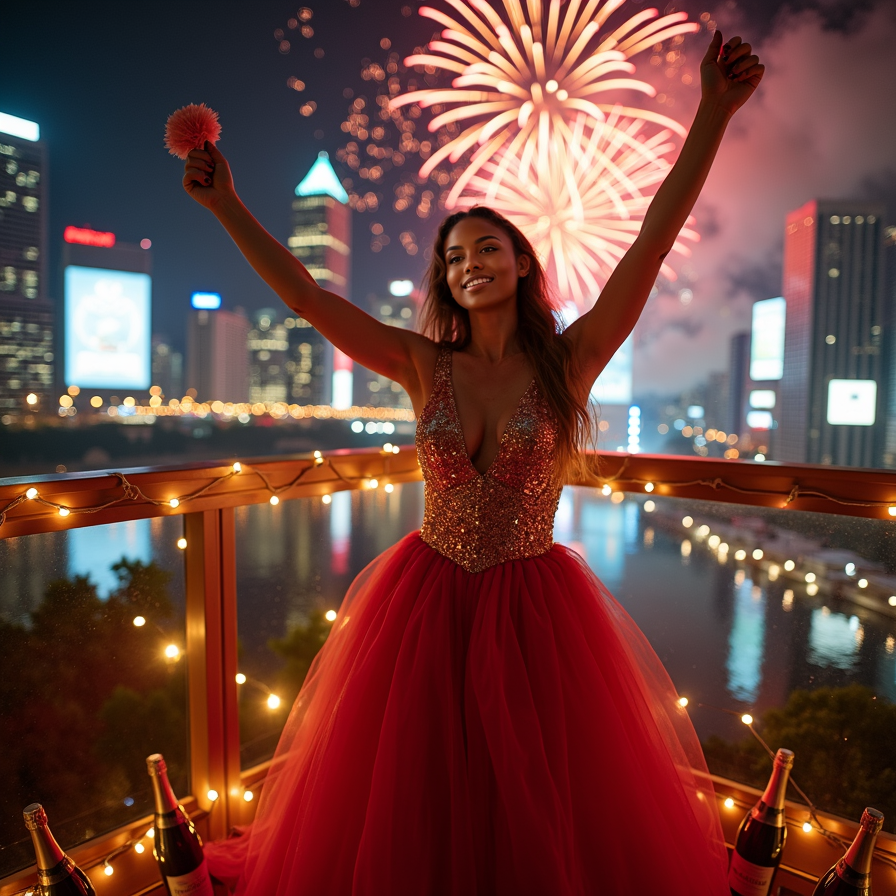 woman in glamorous, floor-length party dress, sparkling sequins and tulle, bold and vibrant in shades of red, gold, and silver, throwing arms up in excitement and joy, holding a noisemaker in one hand, standing on a balcony, against a backdrop of a night sky filled with exploding fireworks, colorful and dynamic, with flashes of light and smoke, capturing the essence of celebration, magic, and new beginnings.