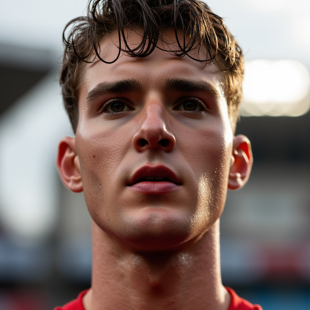 Headshot of a javelin thrower mid-focus before the throw, face calm but intense, sky and stadium in soft blur behind, athlete in national jersey