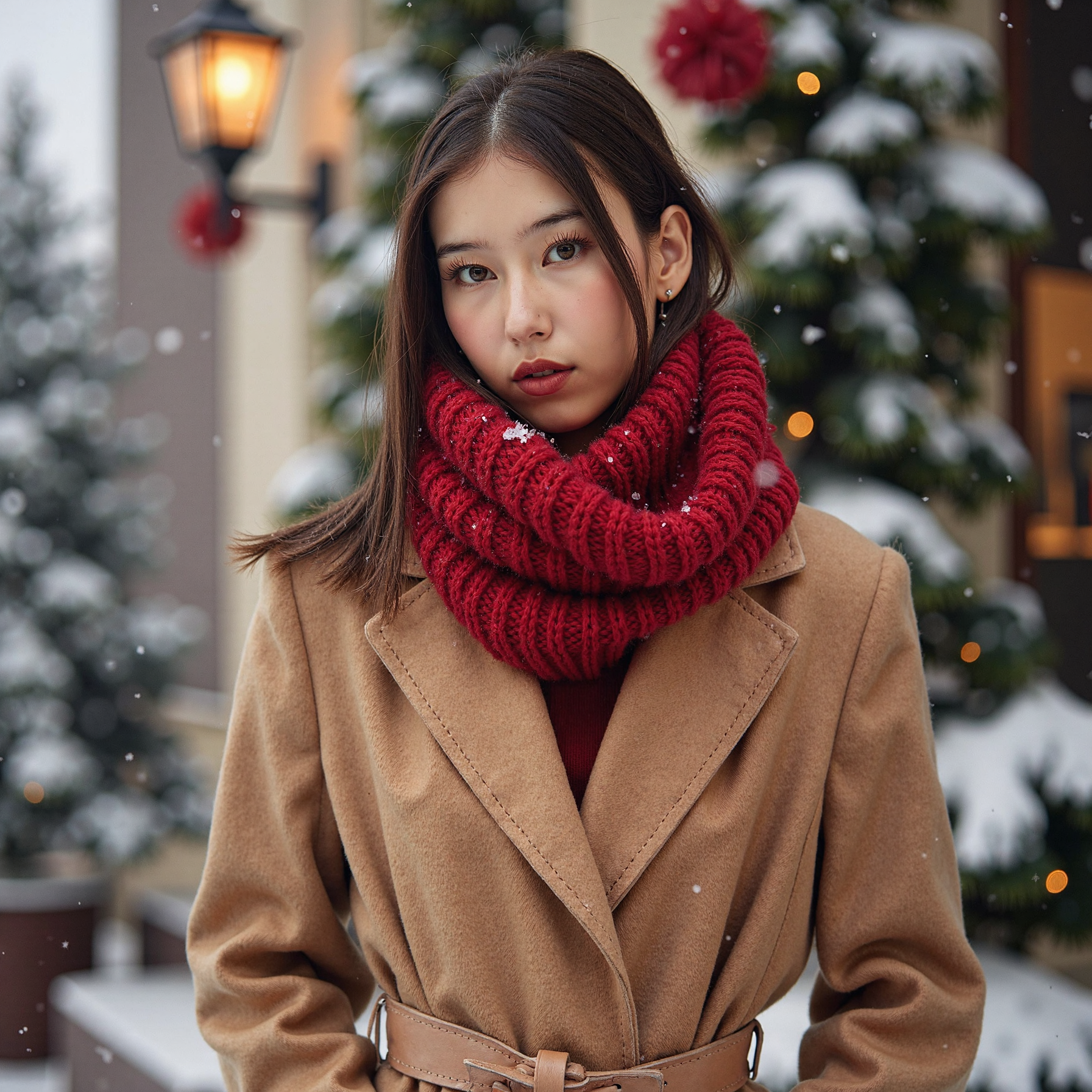 Waist-up winter portrait of a woman outdoors in softly falling snow (snow frozen in shallow DOF but no subject motion). She wears a camel wool coat belted at the waist and a thick red knitted scarf with visible chunky stitching. Hair: straight, long, tucked inside the scarf; a few flyaway strands adding realism. Makeup: satin warm-nude lips, lightly flushed cheeks, soft brown eyeliner. Lighting: natural overcast daylight softened by snow, with a faint silver reflector fill from below. Background: blurred evergreen trees with a few warm twinkle lights; minimal clutter. Camera: 85mm f/2, eye-level; highly realistic, highly detailed, HDR, clear snowflakes on hair and coat fibers.