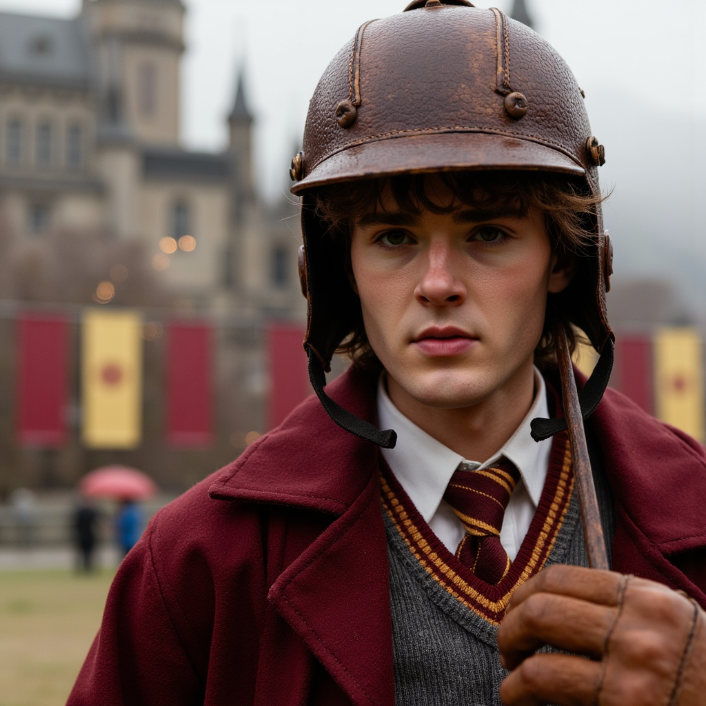 Highly detailed telephoto HDR portrait of a 17-year-old male Quidditch captain with tanned skin and a sweat sheen, strong cheekbones, and determined amber eyes, sandy-brown hair windswept beneath a weathered leather helmet with creases and cracked texture; wearing heavy maroon-and-gold wool Quidditch robes with frayed cuffs and stitched crest, leather gloves gripping a brown Quaffle with deep grain; shot on a Canon…