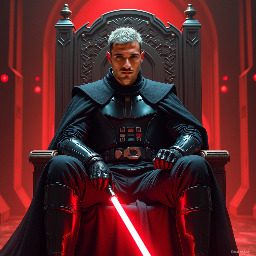 A male Sith Lord sits on a throne, facing the camera with an intense, fierce expression. Dressed in dark armor, he holds a red lightsaber across his lap, with shadows surrounding him. The red glow of lights in the chamber adds an ominous atmosphere.