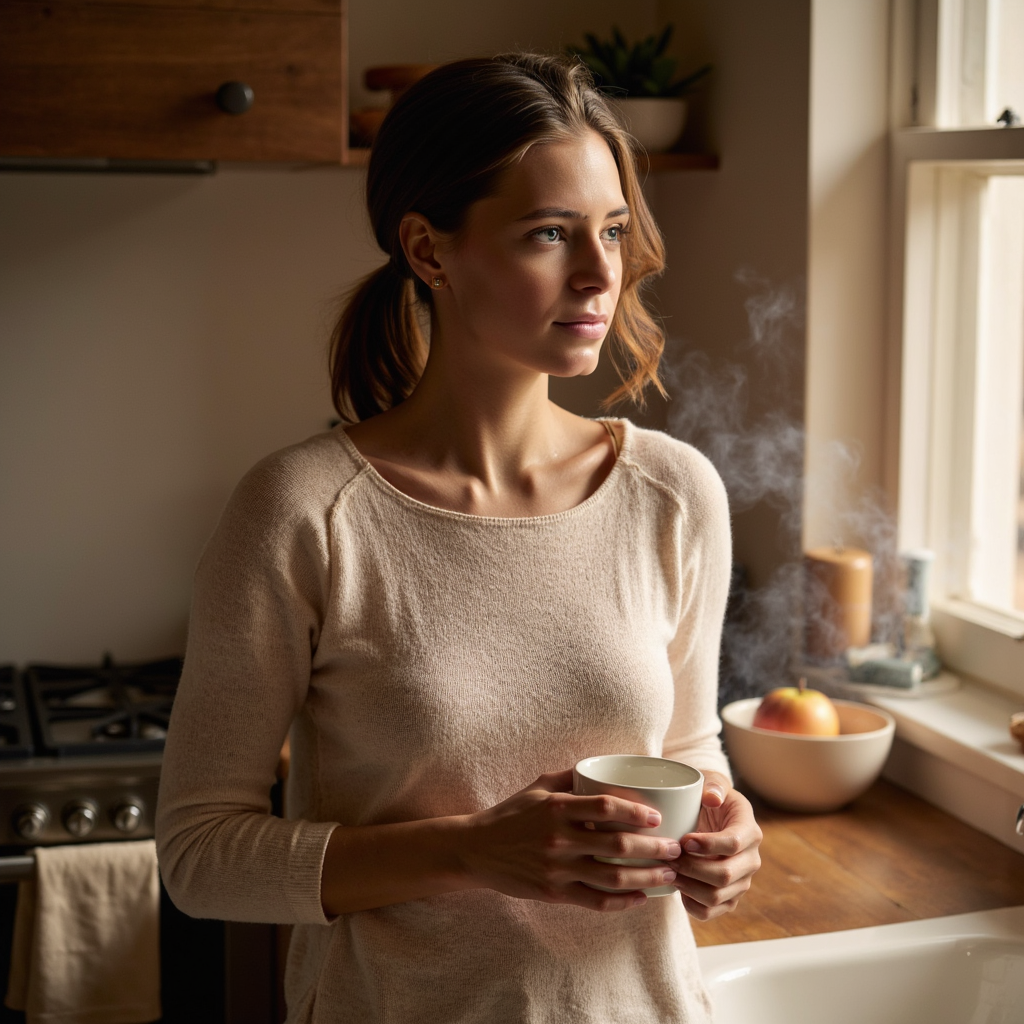 Highly detailed, highly realistic, hyperrealistic HDR image of a woman (female, ~33 yrs) standing waist-up in a cozy kitchen illuminated by soft early-morning light. She wears a light oatmeal sweater with subtle rib texture and rolled sleeves. Her hair is tied in a loose ponytail with natural flyaways catching light. Camera positioned slightly above eye level (~15° down), capturing her serene half-smile as she looks toward the window. Gentle steam from a mug she’s loosely holding adds atmosphere. Background blurred — faint wooden counter, bowl of apples, linen towel in muted tones. Lighting diffused and warm, shadows soft. Visible skin pores, sweater fibers, and condensation on the mug. HDR, high resolution, high quality, highly detailed, photorealistic.