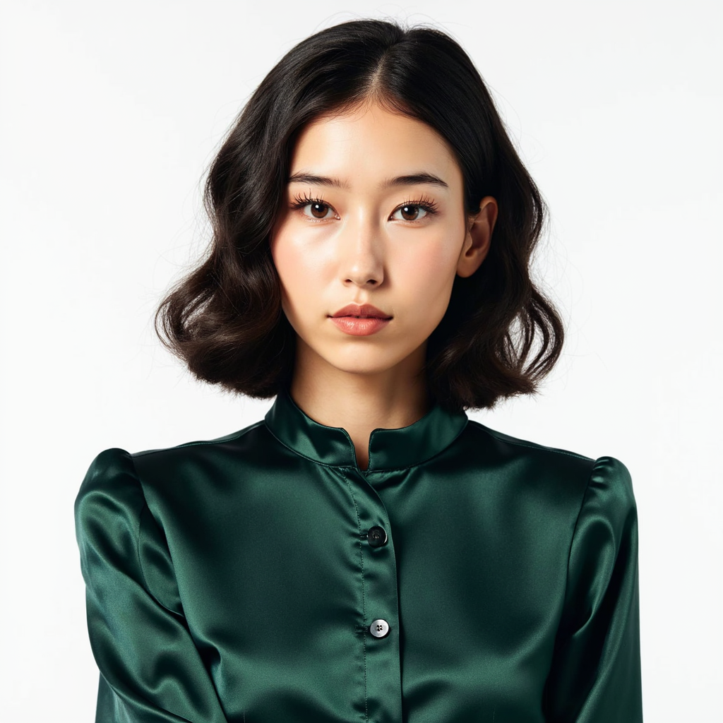 A highly realistic, highly detailed HDR professional passport photo of a woman in her early 40s. She has curly black hair styled in a neat, controlled shoulder-length look, gently pulled back to reveal facial contours. She wears a dark emerald blouse with a soft silk-like sheen. The lighting includes soft frontal illumination plus a subtle hair light behind her, adding separation from the pure white background.…