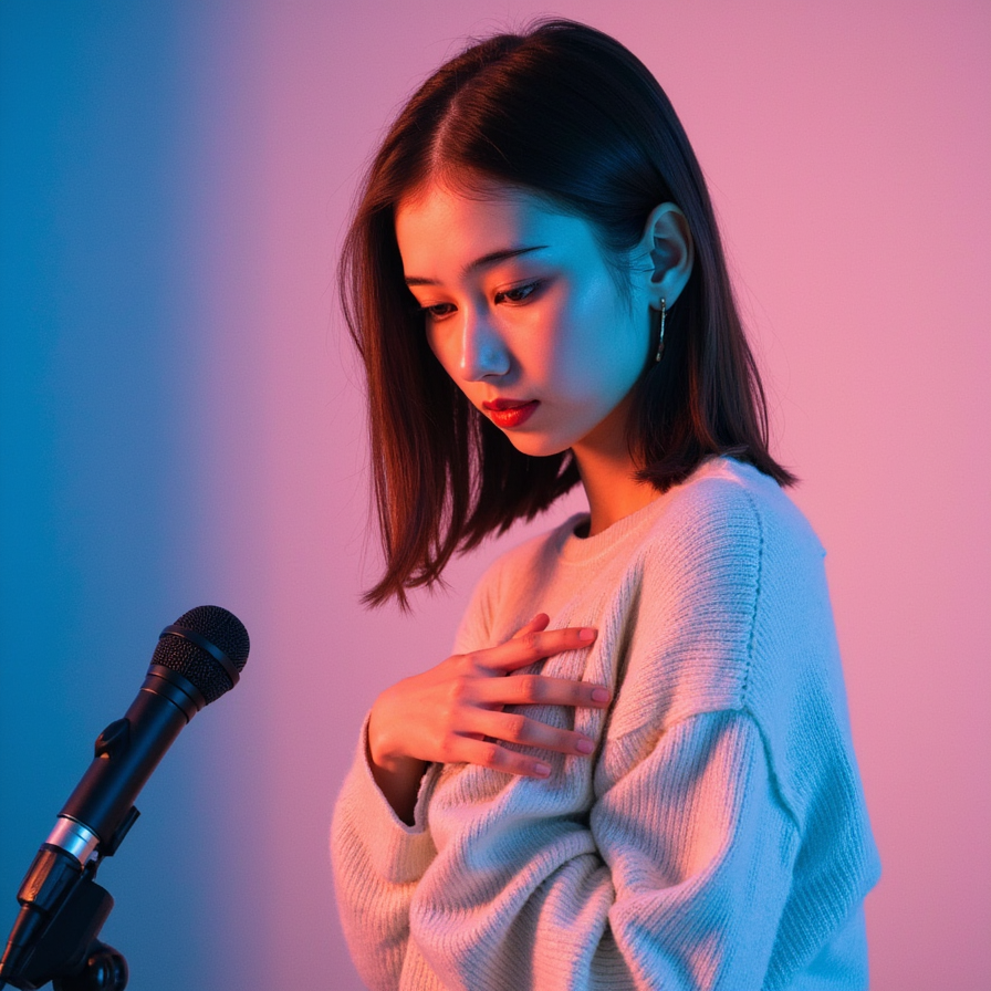 A female creator early 30s, tight head-and-shoulders, positioned right, sad and emotional expression, mouth slightly trembling, eyes looking downward in remorse. Facial details: natural skin, light makeup, visible sadness in her eyes. Outfit: light sweater with visible soft fabric texture. Hair: shoulder-length with loose waves, soft movement. Pose: one hand placed near the chest, other hand holding a phone or piece…