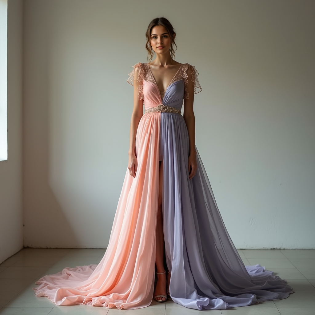 Stunning woman, multi-colored gown, plain wall, professional shot.