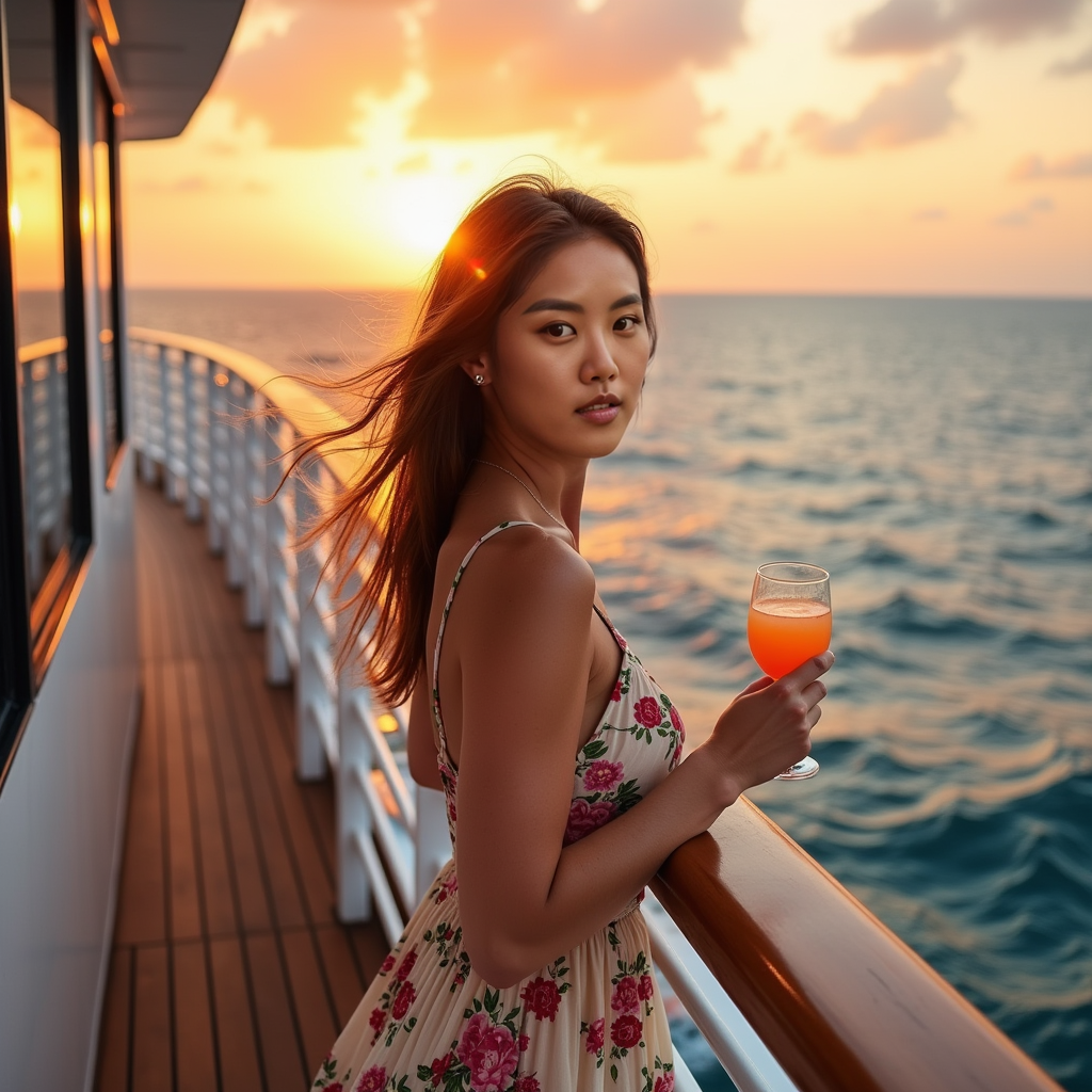Woman in sundress, cruise deck, sunset, relaxed pose.