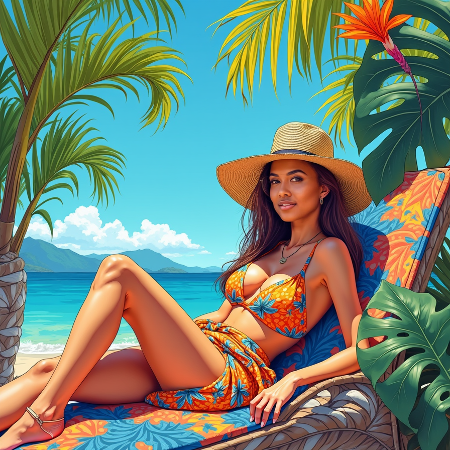 A fully coloured vibrant sketch of a woman lounging in a tropical paradise, surrounded by large, brightly colored palm leaves and exotic flowers. She wears a flowing, tropical-patterned sarong, her sun hat casting a soft shadow over her relaxed face. The sketch features vivid blues, greens, and yellows, with the bright sunlight creating high-contrast shading. The sketch style is loose and playful, with thick outlines…