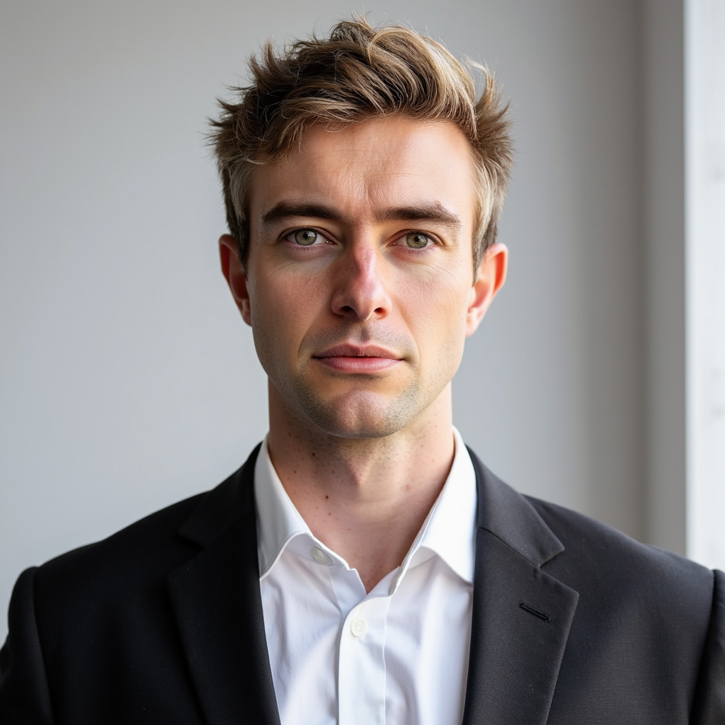 A highly detailed passport photo of a man in his mid-40s, captured in a classic headshot style with a professional black suit and a white dress shirt. His hair is short, graying at the temples, and he has a neatly trimmed beard. The background is a muted white with a slight gradient, keeping it clean and professional. The lighting comes from the right side, casting soft, natural shadows on the left side of his face,…
