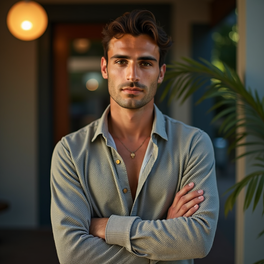 man with a relaxed vibe. He is wearing a stylish button-down shirt or knit sweater, with a warm, natural backdrop like a park or studio. The expression is friendly and confident, perfect for creators with a laid-back style