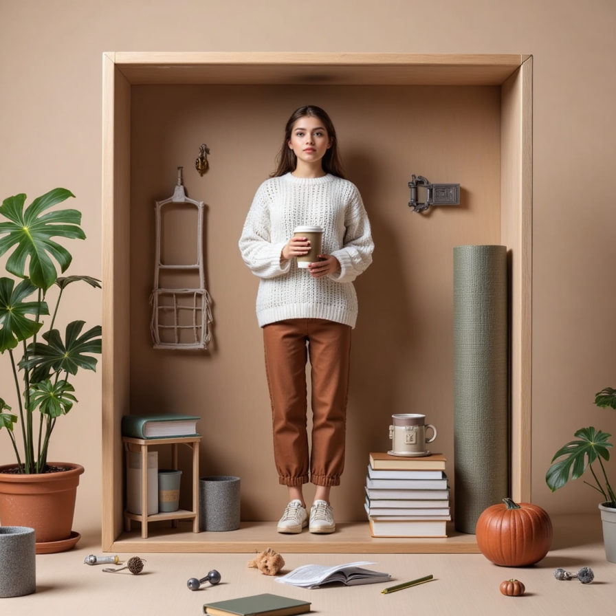 Relaxed woman in oversized sweater, holding a coffee, surrounded by books and a yoga mat, in beige packaging