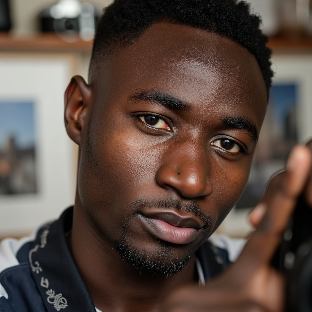 Stylized headshot of a photographer in action, mid-click with camera raised, blurred background, focus on intent gaze and posture, celebrating World Photography Day