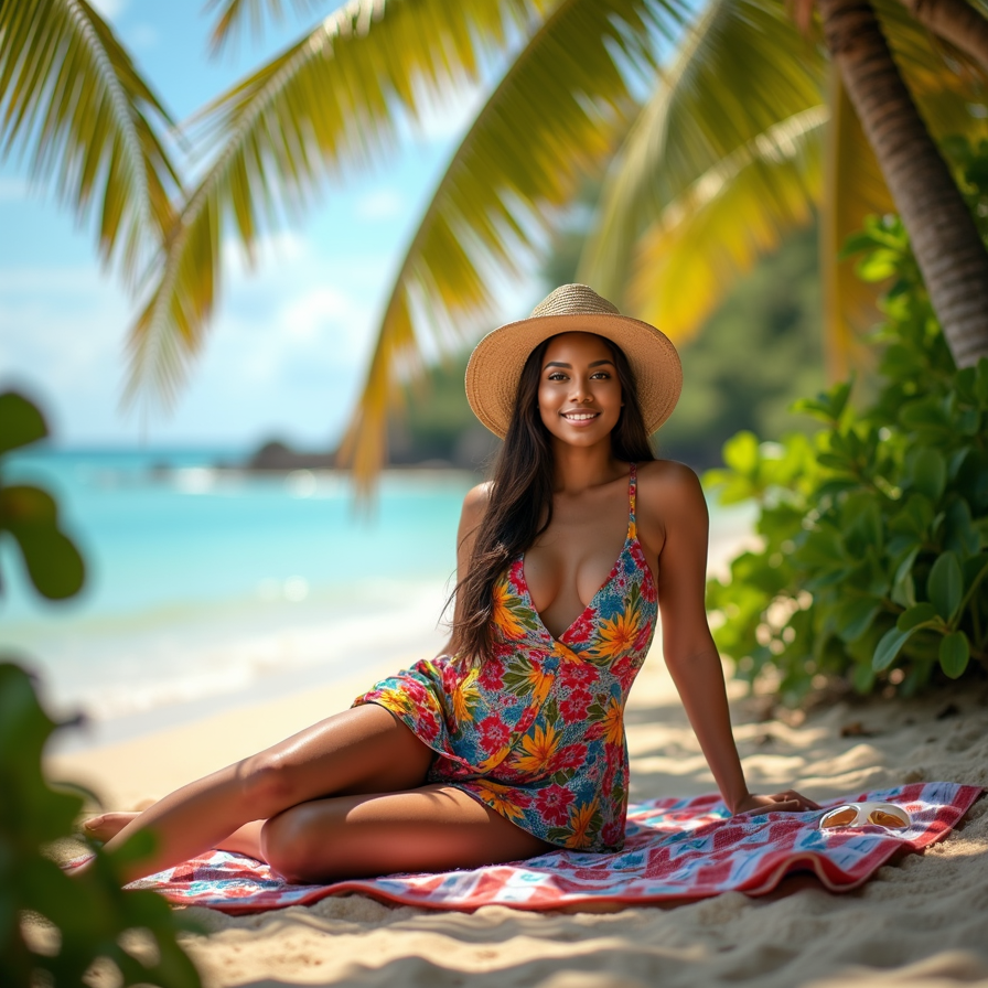 woman in a colorful swimsuit, lying on a beach towel, with a pair of sunglasses and a beach hat, surrounded by tropical palm trees and a calm ocean in the background, under the warm glow of a sunny day.