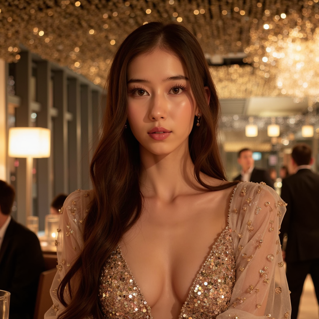 A highly realistic portrait of a woman dressed in an elegant New Year outfit, soft warm lighting, subtle fireworks bokeh in the background, clean composition suitable for a greeting card, shallow depth of field, polished festive mood, high detail, HDR, minimal background clutter