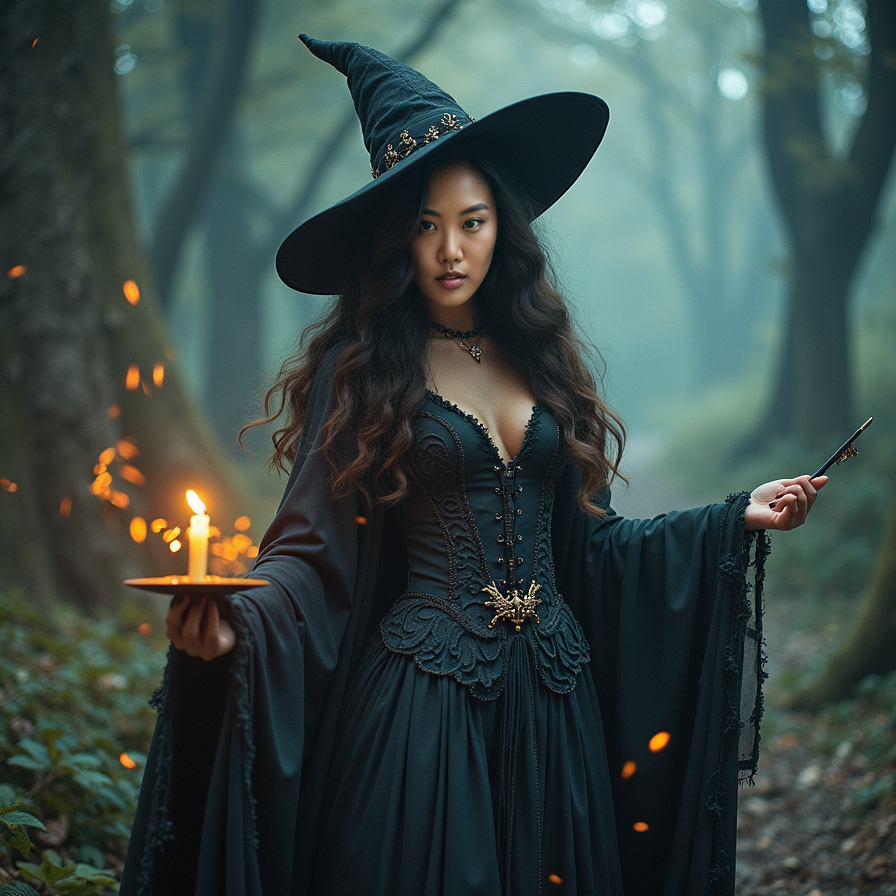 woman in intricate, mystical witch robes, mystical forest backdrop, warm candlelight, wand in hand, dynamic pose