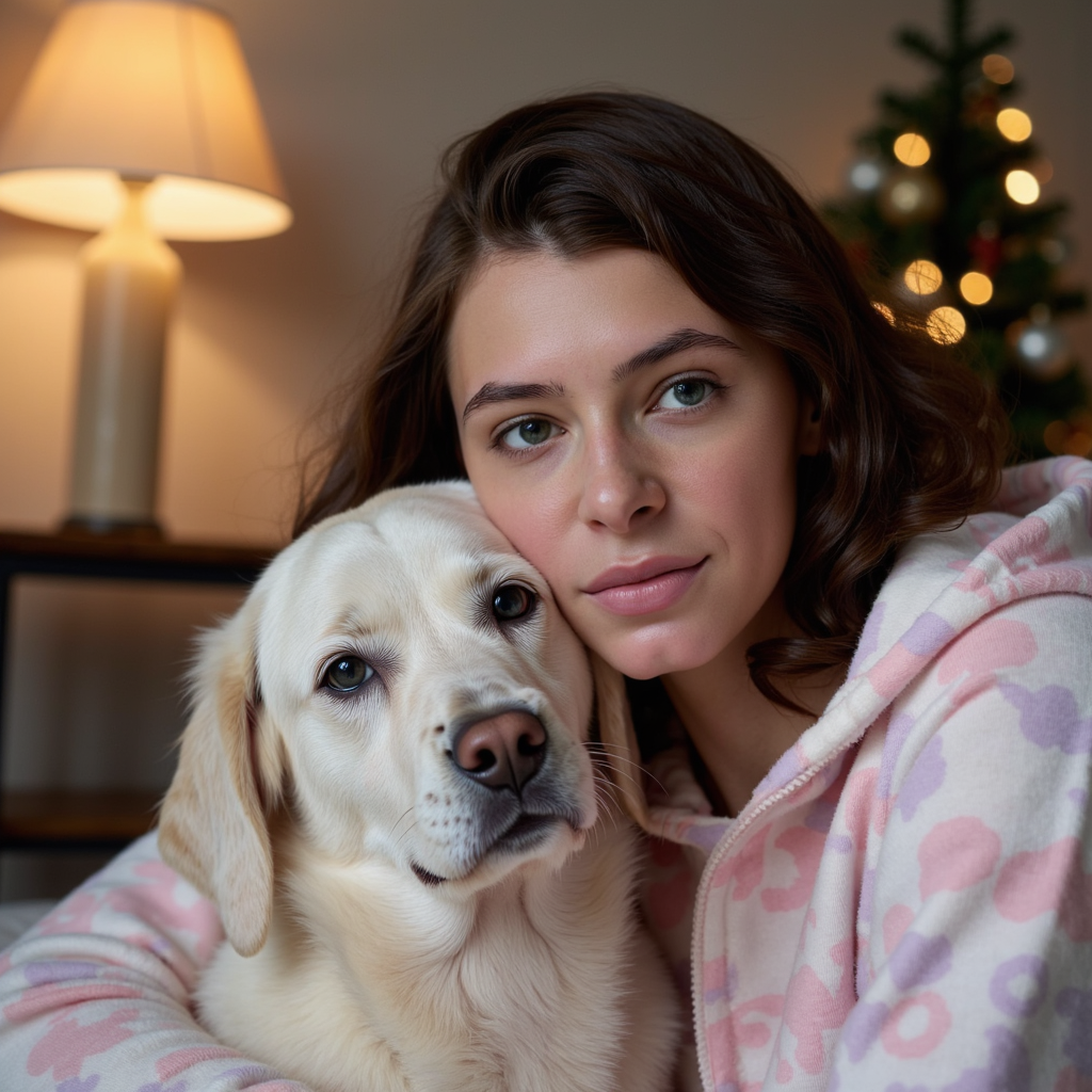 Gender: Female Pose: Close-up with her pet dog, both looking relaxed. Attire: Comfortable pajamas, a cozy, patterned hoodie in pastel colors. Hairstyle: Loose and natural, with some curls framing the face. Lighting: Soft, warm light from an overhead lamp, casting a cozy glow around the subject and the pet. Background: A living room with minimalistic decorations, including a small Christmas tree in the corner,…