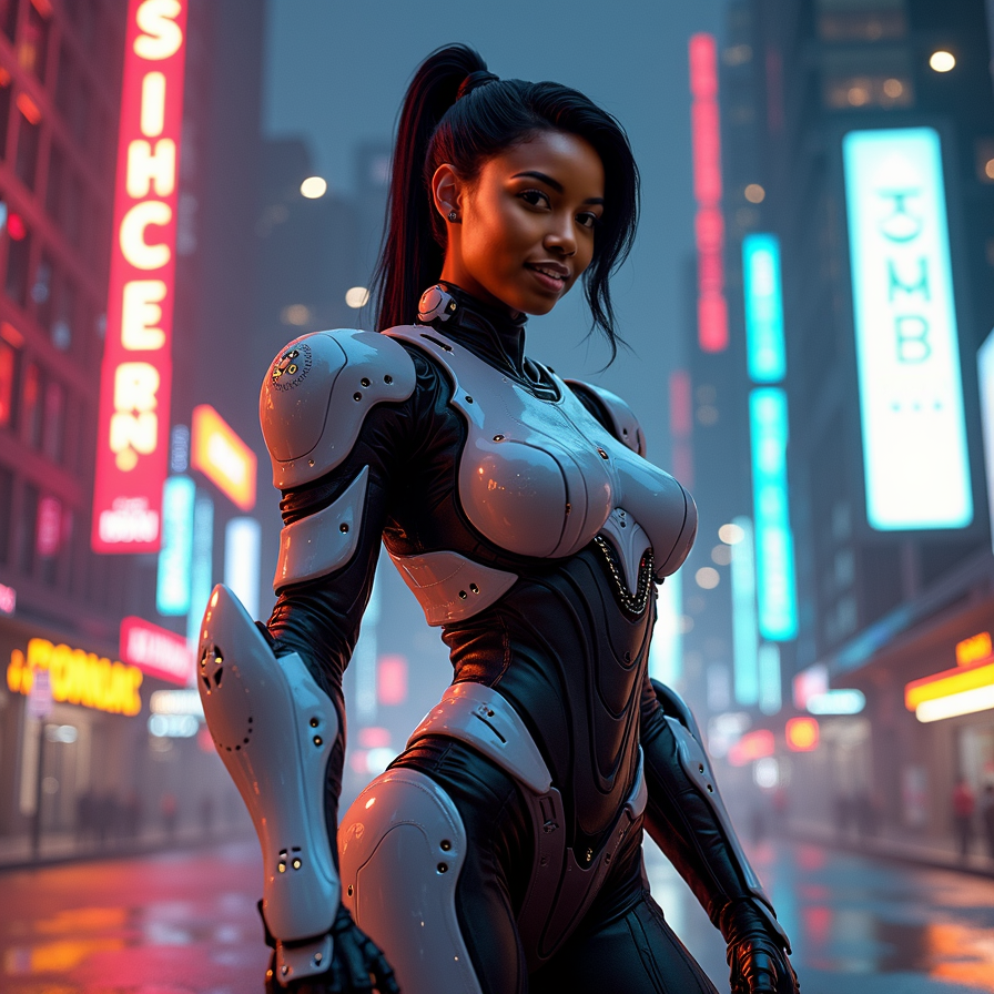 woman in futuristic cyborg armor with neon lights and metallic limbs, sleek black hair styled in a futuristic updo, posing with confident and powerful stance against a dark, neon-lit urban cityscape backdrop with towering skyscrapers and holographic advertisements, soft focus on the armor's metallic limbs and neon accents, sharp focus on the woman's determined facial expression.