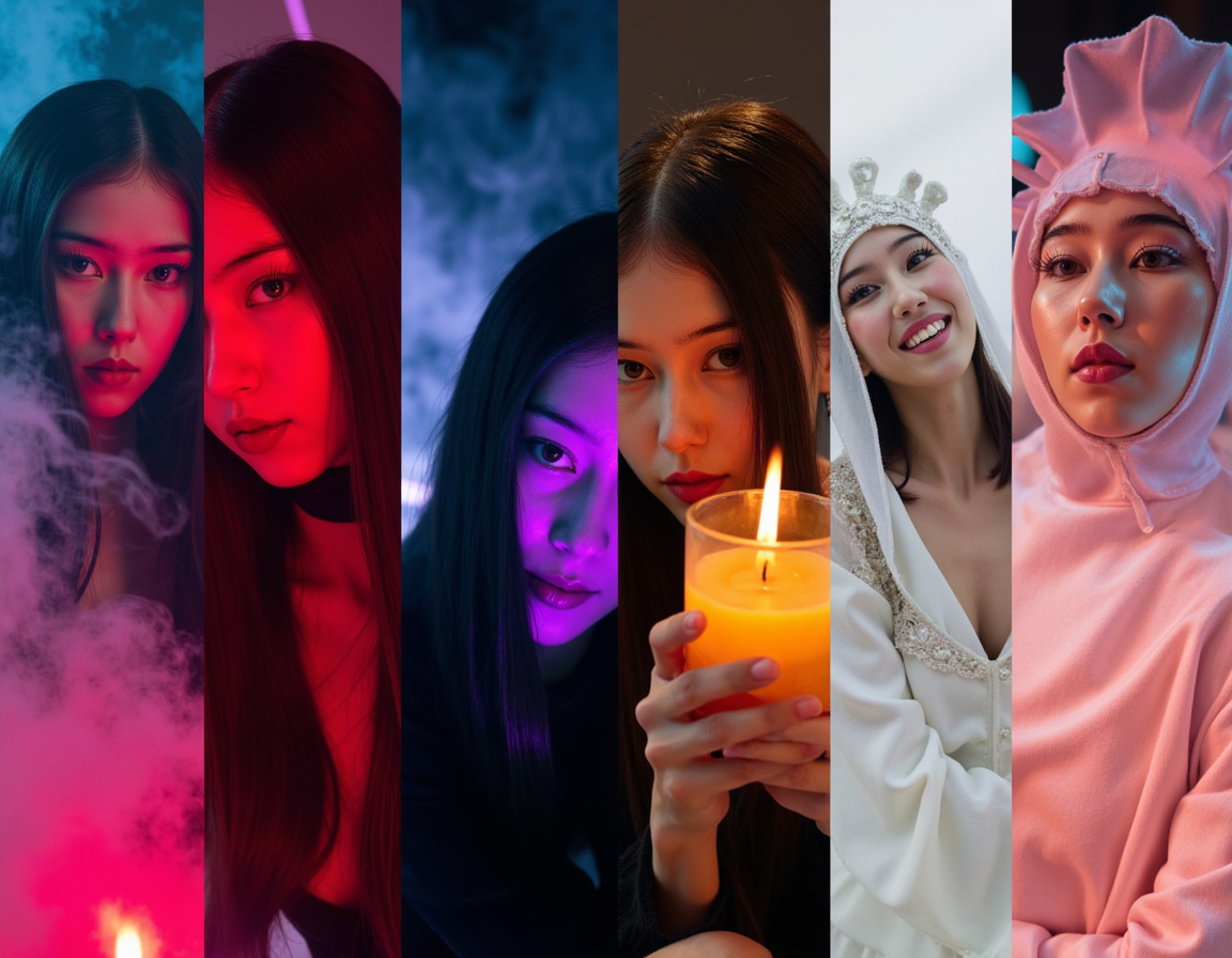 collage of 4 halloween ai portraits showing emotion diversity — (1) gothic woman in crimson mist with subtle tears, (2) futuristic vampire in neon purple glow, (3) victorian ghost smiling softly in candlelight, (4) dreamcore girl under pastel fog — cinematic lighting, cohesive moody tone, no text