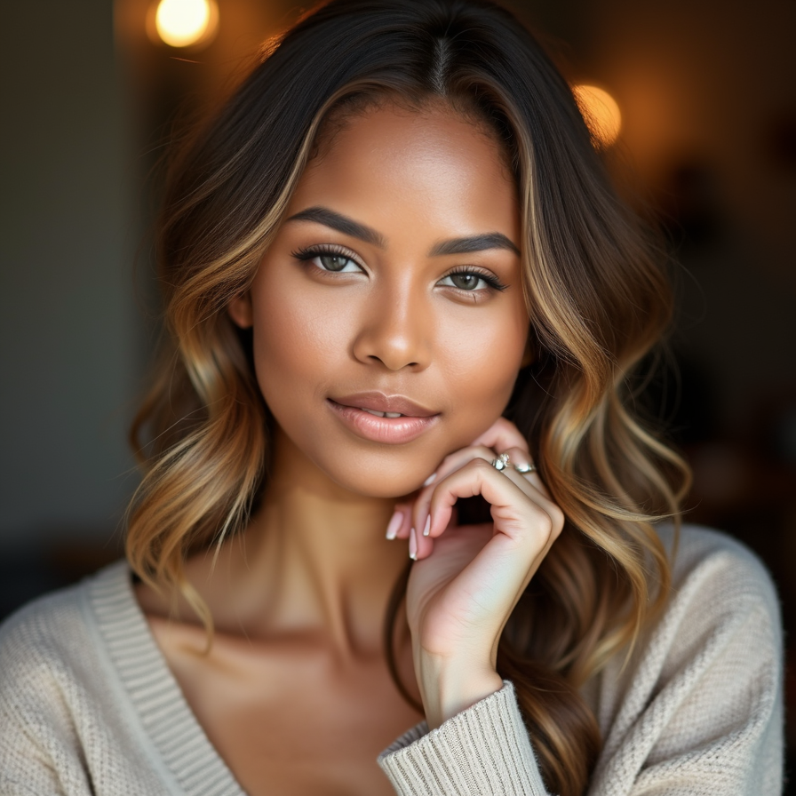 woman designed for a high-impact dating profile. She is styled in elegant yet casual attire, with subtle jewelry adding a touch of sophistication. The backdrop is neutral or softly blurred, with lighting that accentuates her features, creating a captivating image