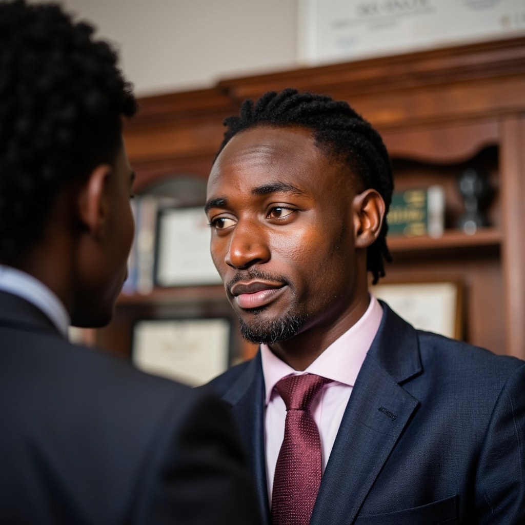Close-up, 85 mm f/1.8. Man in early 40s, tan skin, wavy black hair combed neatly back. Navy blazer with micro-check pattern, pale pink dress shirt. Leaning in attentively toward an off-camera client silhouette. Lighting: soft daylight from window on camera left. Background: blurred certificates on wall.