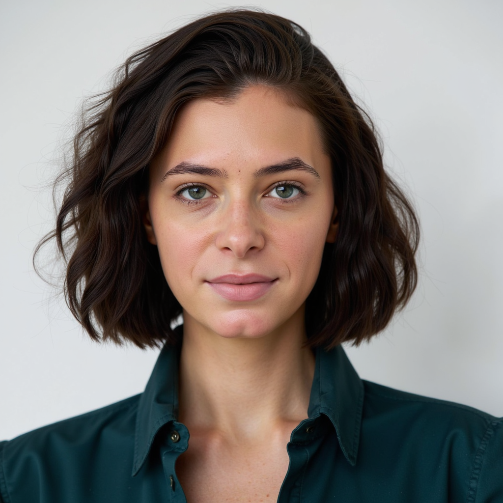 A highly realistic, highly detailed HDR professional passport photo of a woman in her early 40s. She has curly black hair styled in a neat, controlled shoulder-length look, gently pulled back to reveal facial contours. She wears a dark emerald blouse with a soft silk-like sheen. The lighting includes soft frontal illumination plus a subtle hair light behind her, adding separation from the pure white background.…