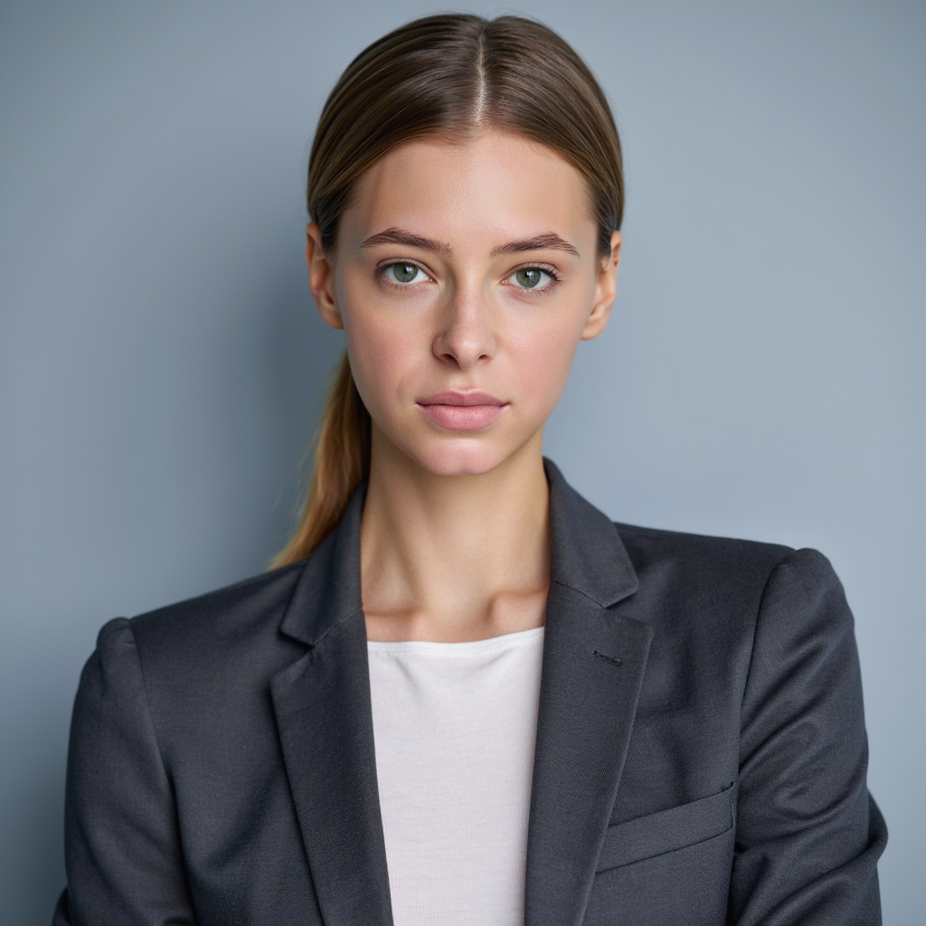 A highly detailed, highly realistic HDR passport-style headshot of a woman in her early 30s with fair skin. She has long, smooth blonde hair tied neatly into a mid-height ponytail with no loose strands. She wears a fitted charcoal gray blazer over a simple matte white top. Lighting is cool-toned, evenly balanced, eliminating all shadows and giving a crisp, clean complexion. The background is a uniform pale blue-gray,…