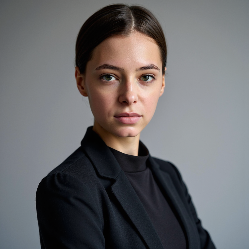 A highly realistic passport photo of a young woman, framed in a waist-up shot. She wears a tailored black blazer with a high-collared blouse, emphasizing a clean, polished look. Her hair is styled in a simple, neat updo, with a few loose strands framing her face. The lighting is soft and even, with a slight light falloff at the edges to create depth. The background is a soft gray with a minimal blur, ensuring the subject remains the focal point. The image is captured at eye level, with the camera slightly to the left, capturing her from a slight angle while maintaining a neutral, professional expression. The fabric of her blouse and jacket are highly detailed, with subtle texture visible. The shot is HDR for perfect clarity, showcasing her detailed features and clothing.