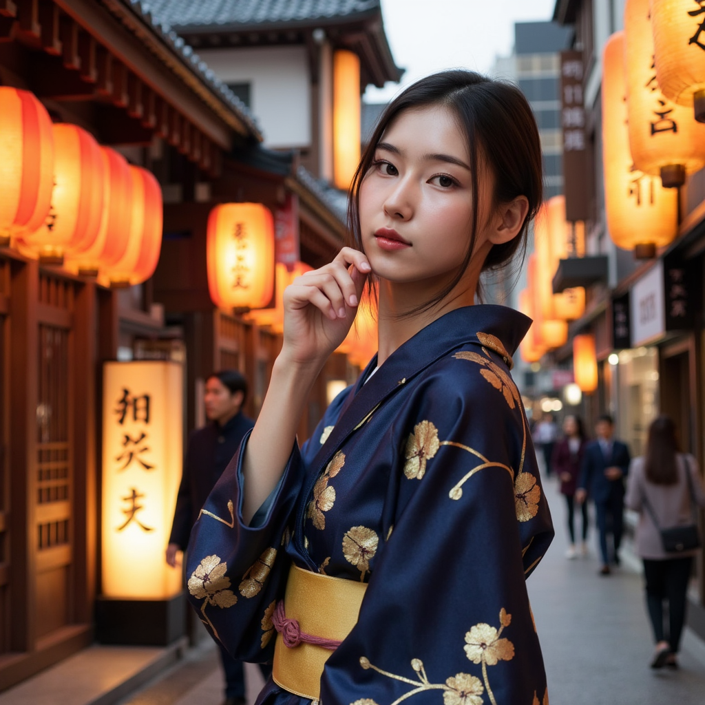 close up shot of a woman wearing a contemporary kimono in shades of deep indigo and gold, cinched with a wide obi belt, standing gracefully with one hand lightly touching her chin in a thoughtful pose. She is in a bustling traditional Japanese street, with vibrant paper lanterns illuminating the intricate wooden architecture of an ancient Shinto shrine in the background. The lighting is soft and warm, capturing the…