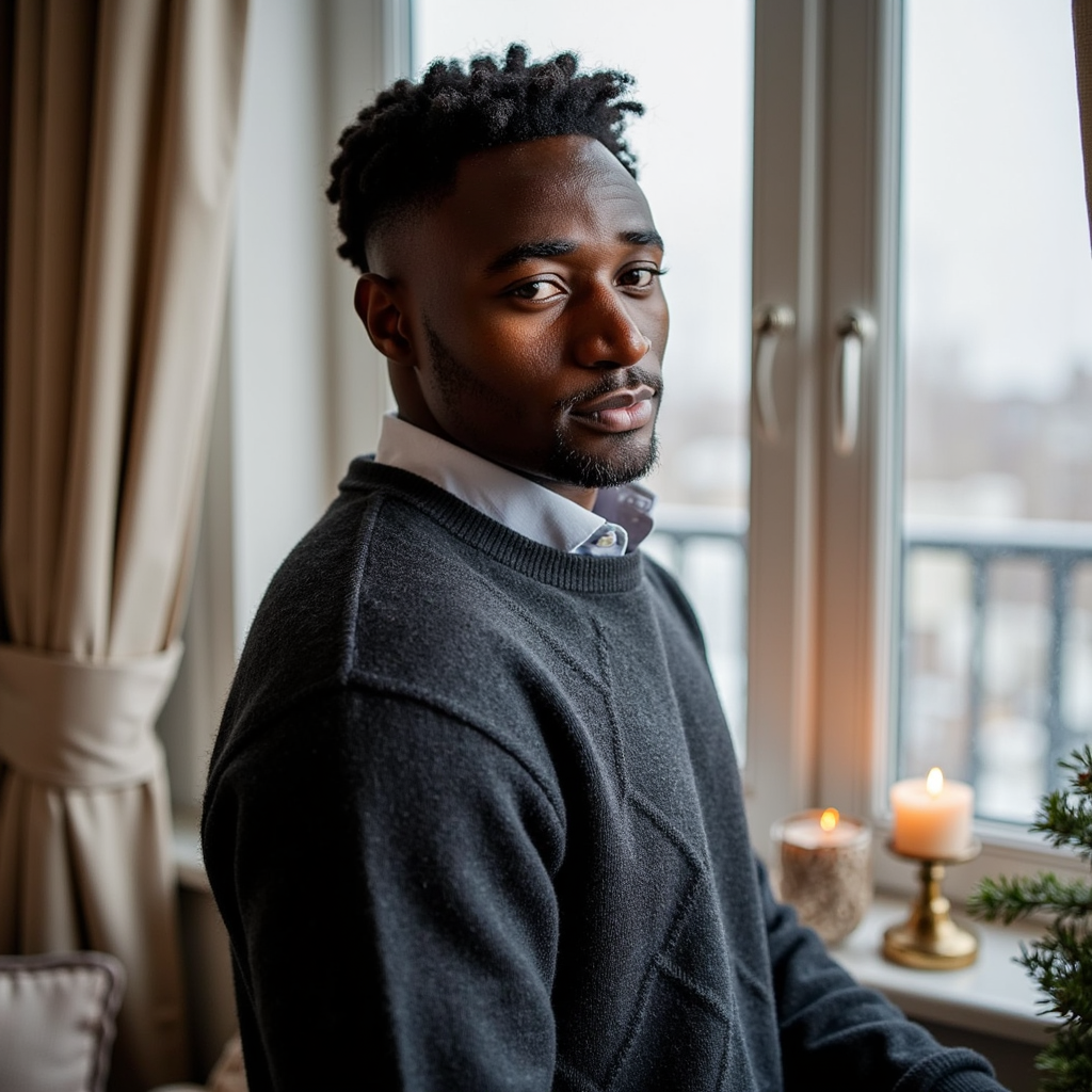 Waist-up portrait of a man standing at a frost-kissed bay window, turned 30° away from camera and gazing past the lens, off-center framing. He wears a charcoal wool cable-knit sweater layered over an oxford shirt with a slightly rumpled collar; fine wool fiber texture visible. Hair: short, side-part, lightly tousled; subtle weekend stubble. Lighting: cool north-light window key with a gold bounce fill from the right to add Christmas warmth; faint practical bokeh of a small tree in the background. Background: frosted glass with delicate condensation trails; minimal decor (a single brass candlestick out of focus). Camera: 50mm lens, f/2; highly realistic, highly detailed, HDR; crisp eye catchlights, sweater pattern sharply resolved; calm, still pose.