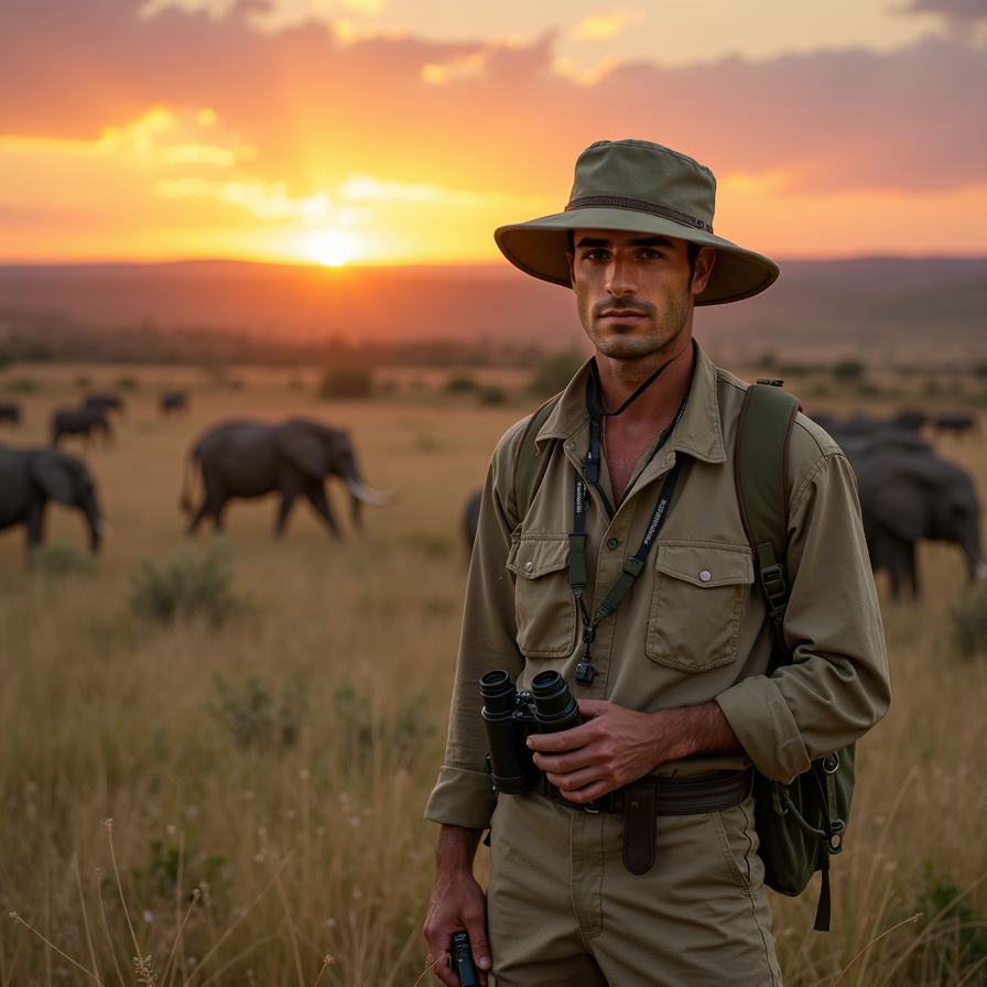 man wearing rugged safari outfit, khaki clothes, and a pith helmet, holding a pair of binoculars and standing in front of a majestic African savannah landscape at sunset.