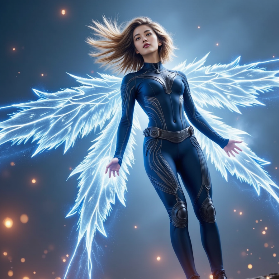 Bold female superhero descending from the sky with wings made of pure energy, futuristic tactical bodysuit with silver-blue highlights, lightning storm backdrop, heroic Marvel stance, cinematic 4K art