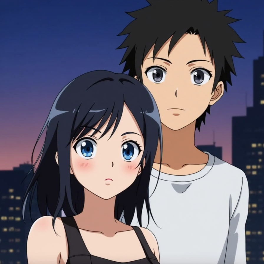 young man with spiky black hair and piercing blue eyes, wearing a sleek black uniform with a silver pin on his lapel, against a dark cityscape at dusk