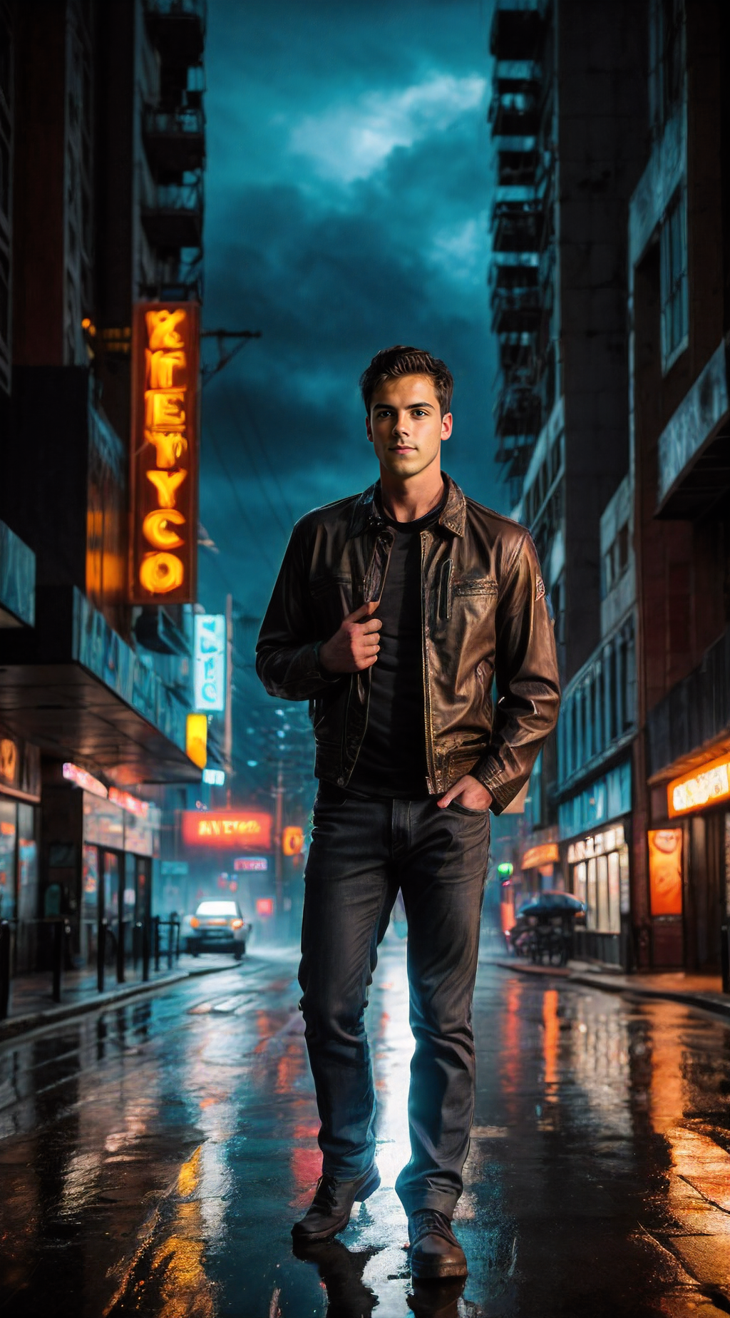 Rugged man, cybernetic implants, neon-lit cyberpunk cityscape, intense gaze.