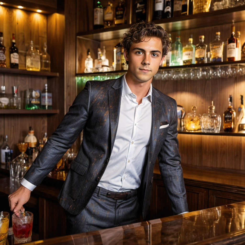 Handsome man in dark bar, seductive smile, party atmosphere.