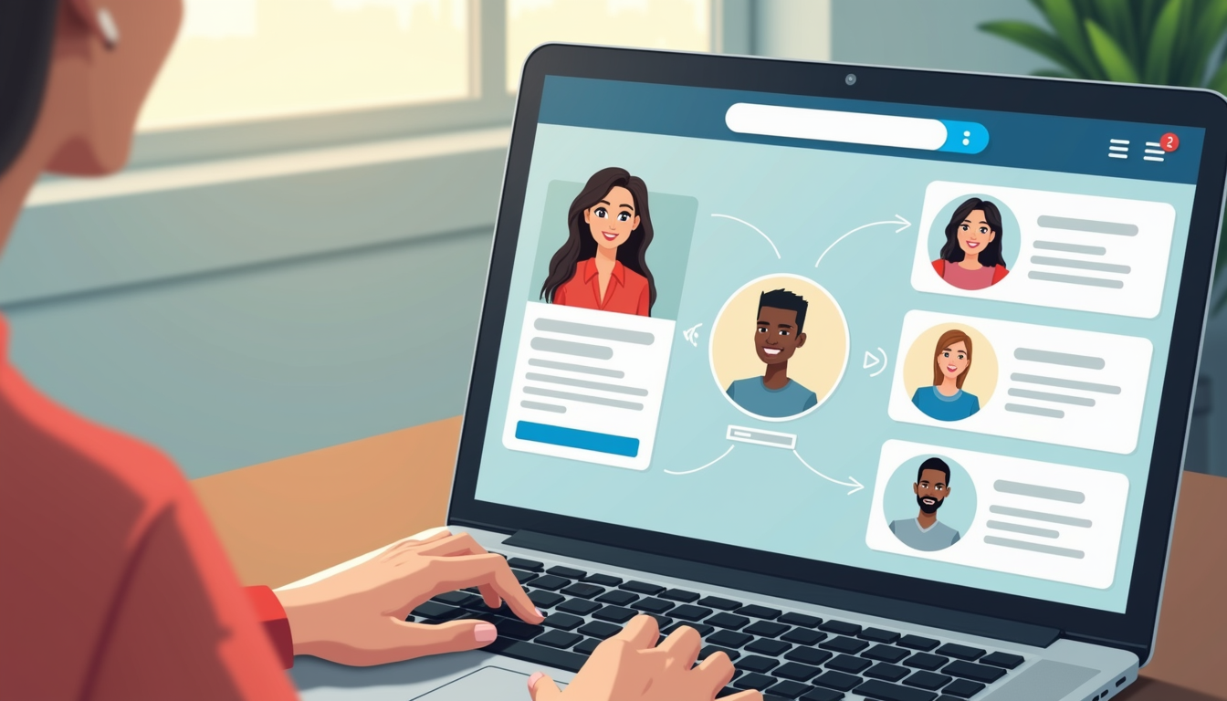A professional digital illustration of a recruiter’s laptop screen showing multiple LinkedIn profiles, where one profile stands out due to a high-quality headshot while others have selfies or missing photos. Slight blur effect on surrounding profiles.