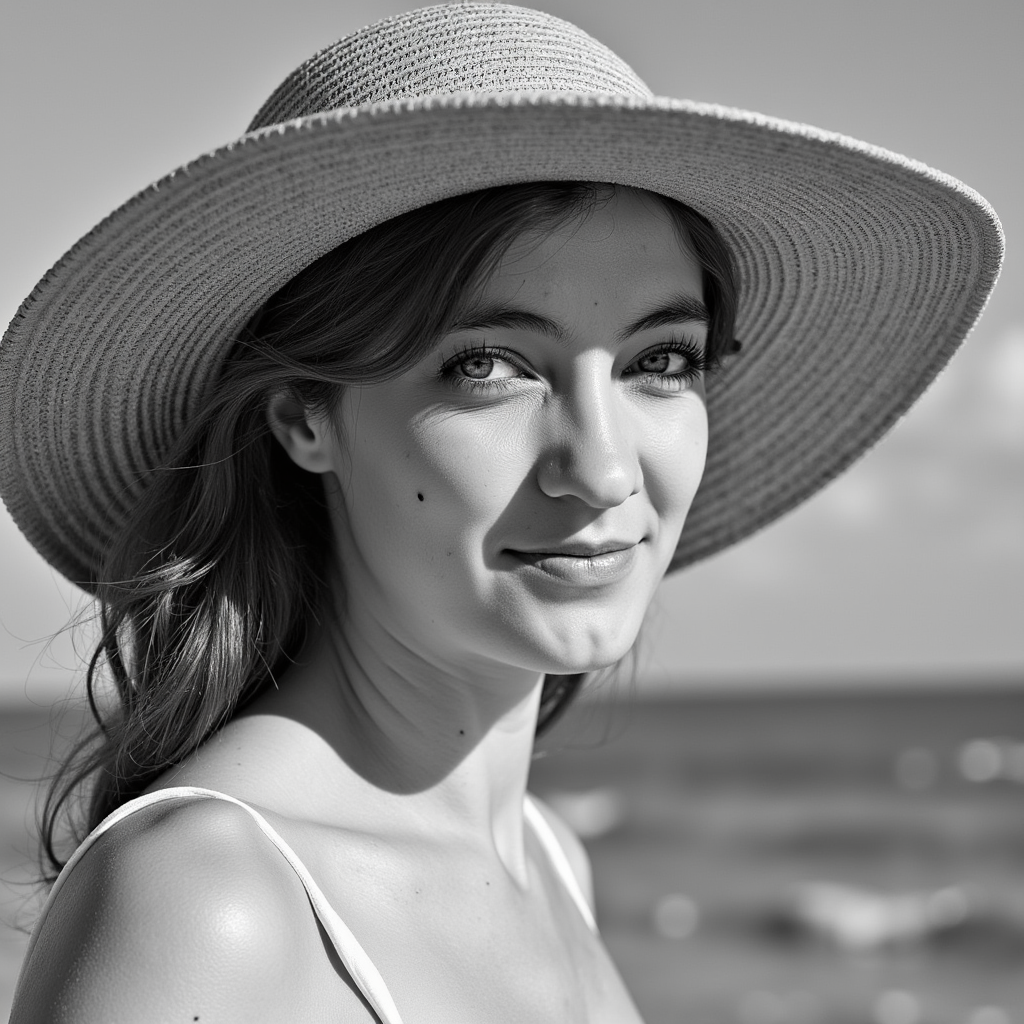 Adult woman — monochrome beachfront close-up portrait (black & white); attire: classic bandeau bikini (matte white) with a wide-brim raffia sunhat; hair: loose waves tucked behind one ear; pose: shoulders angled 20°, eyes to camera with soft smile; camera: 105mm macro used as portrait, f/3.5, ISO 100, 1/1250s; lighting: late-afternoon side light for crisp micro-contrast, white bounce for fill; background: blurred…