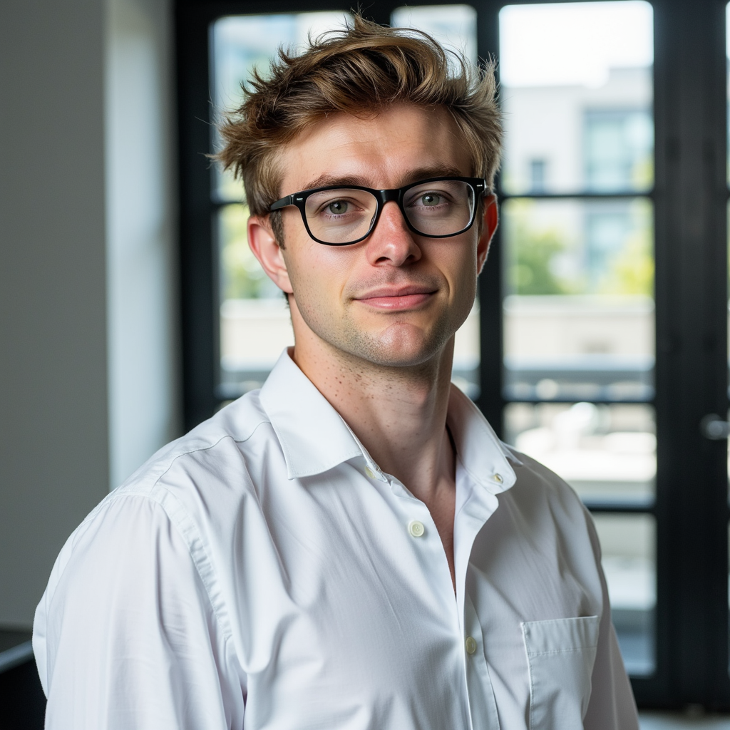 Tight headshot of a man in a white dress shirt, open collar, wearing thin-framed glasses. Calm expression, slight half-smile. Blurred open-office backdrop. Natural lighting from a nearby window casts mild shadows. Light stubble, skin pores, and reflections on glasses captured realistically.