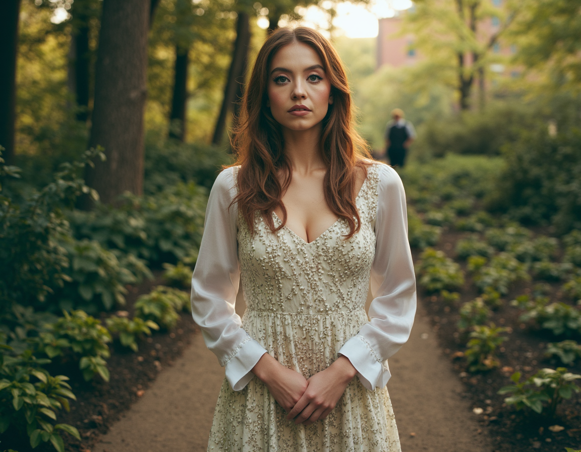 In the foreground, a beautiful woman with flowing chestnut hair and piercing emerald eyes stands gracefully, her long, flowing gown adorned with intricate patterns of vines and flowers. Her hair is adorned with a delicate crown of flowers, and her hands are gently clasped, exuding a sense of calm and wonder. Behind her, a misty, enchanted forest stretches into the distance, with towering ancient trees, glowing…